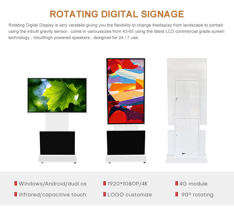 Our 90° rotation LCD display, also known as a rotating LCD display, is a specialised type of digital signage solution that allows the screen to rotate 90 degrees, changing from a landscape orientation to a portrait orientation or vice versa.